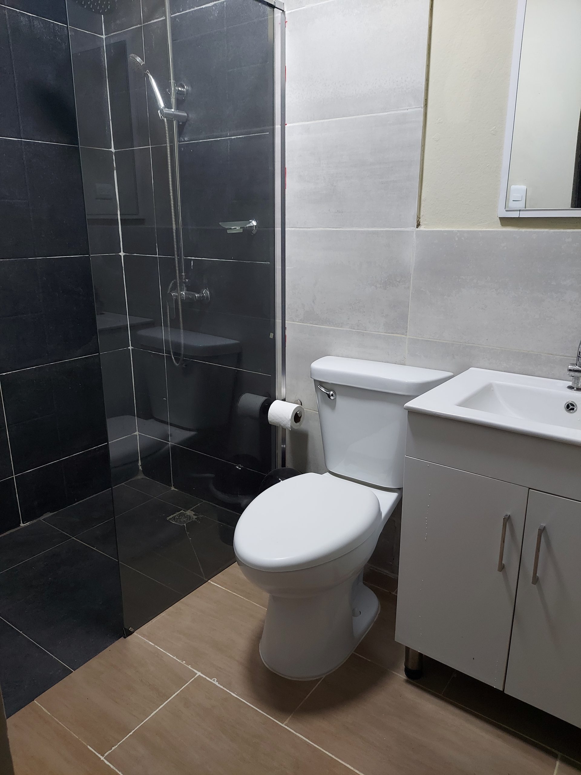 Spacious double room for two persons with full, private bathroom (shower, toilet and sink), work station, executive refrigerator, television, self-controlled air conditioner, queen bed, lunch counter, and window. Set-up is similar to a large, private hotel room with own entrance.